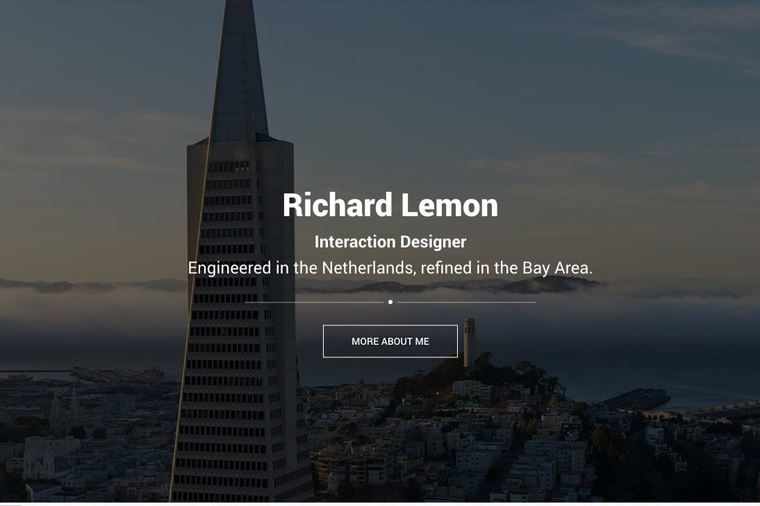 A full-screen hero. The Transamerica Pyramid in San Francisco at dusk, fog rolling over the hills. The headline: "Richard Lemon -- Interaction Designer." And below it, a line I'm still proud of: "Engineered in the Netherlands, refined in the Bay Area."