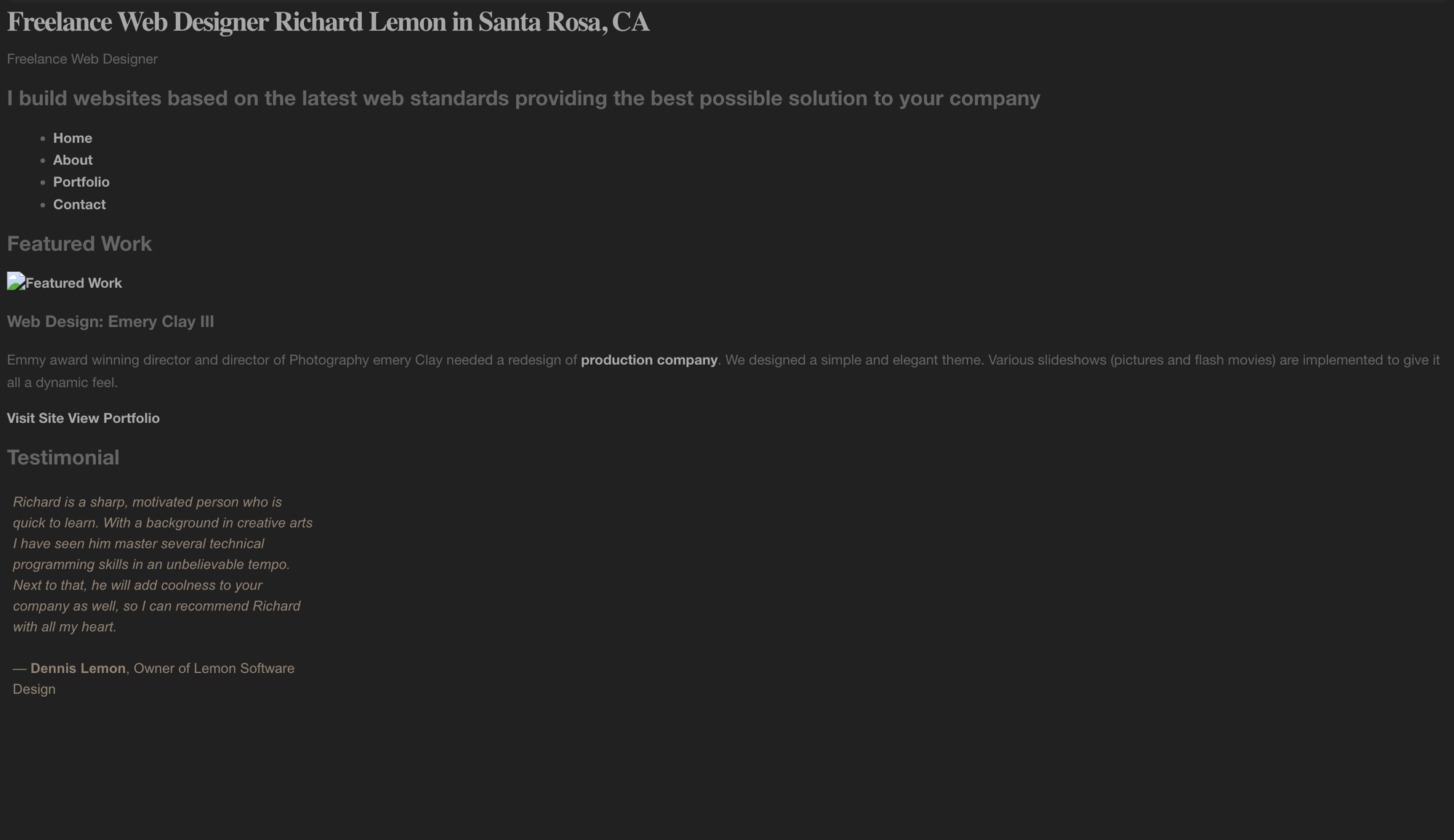 By early 2010 the blog had become a proper freelance portfolio site. Clean layout, testimonials, a full services list, a downloadable CV, and a physical address: 15810 Shawnee Cir., Middletown CA 95461.